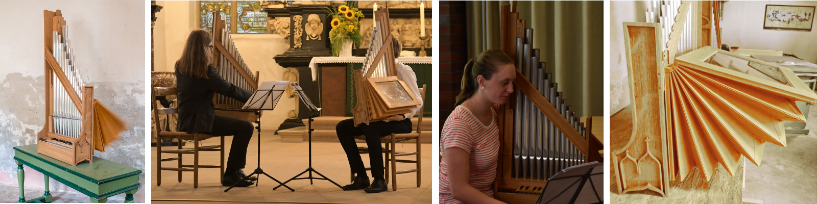 Die beiden baugleichen Portative der Orgelakademie Stade wurden von Gregor Bergmann aus Leer angefertigt und sind mit einigen Fenstern ausgestattet, die einen Blick ins Innere erlauben und zum tieferen Verständnis der Funktion beitragen.